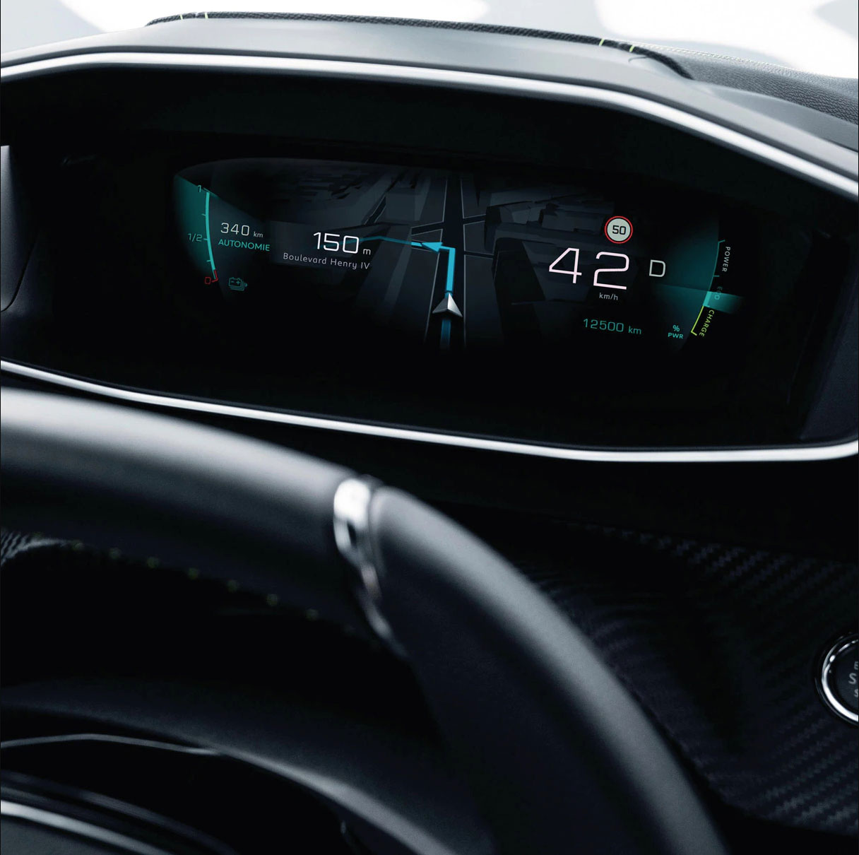 Cuenta con una pantalla holográfica futurista 3D que queda justo a la altura de los ojos. Los datos sobre el vehículo y la conducción se visualizan con total legibilidad en dos niveles de lectura en función de la importancia o de la urgencia (seguridad, ayudas a la conducción, navegación).